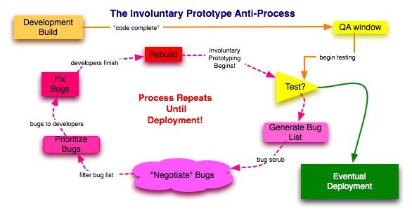 The Involuntary Prototype anti-process resulting from relaxed QA Acceptance standards and the cyclical nature of bug fixes and testing.